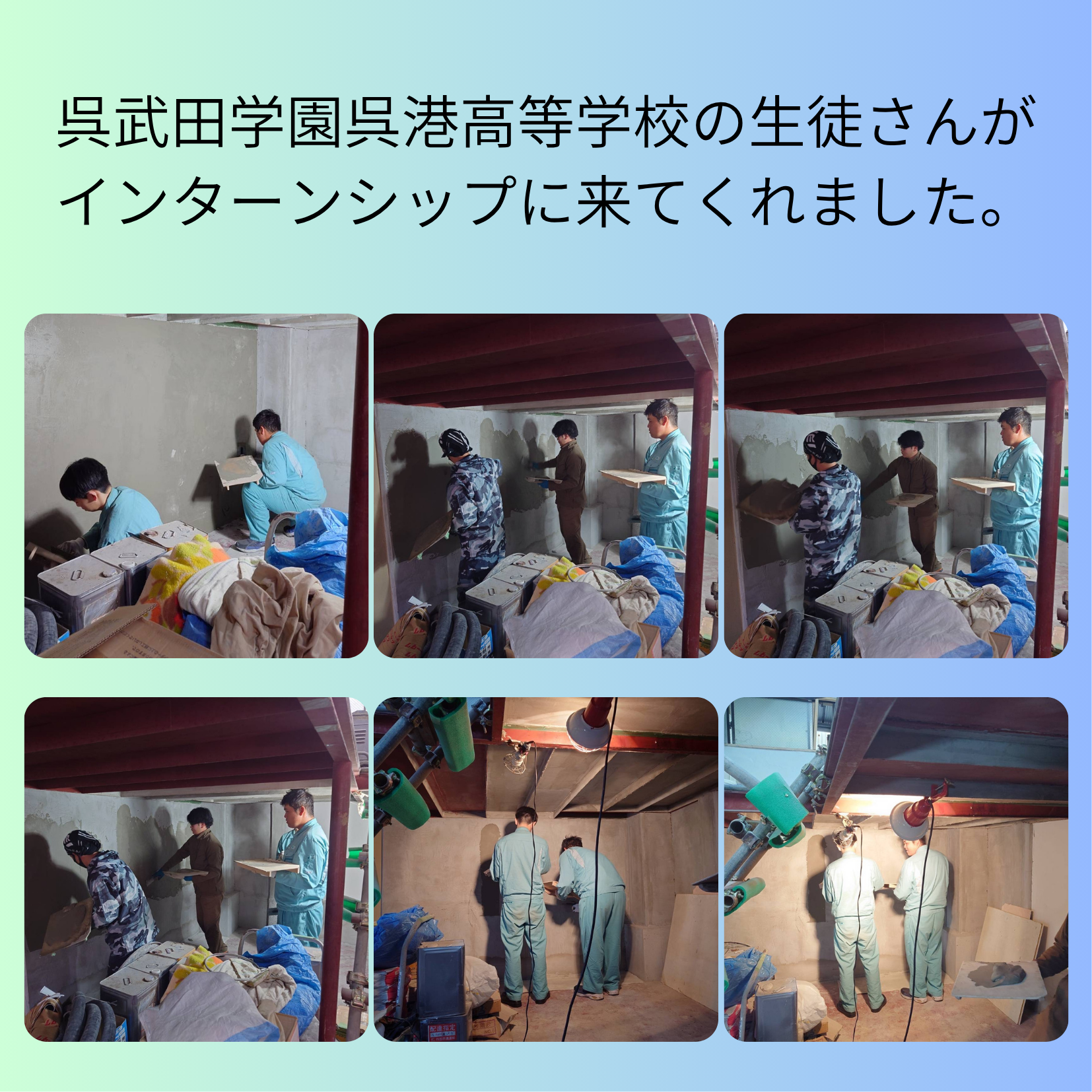 呉武田学園呉港高等学校の生徒さんがインターンシップに来てくれました。 ブログ 2025.11.12 インターンシップおつかれさまでした。左官の仕事は、地道な作業の積み重ねで形をつくる職人の世界です。今日感じたこと、手で触れた感覚を大切にしてください。これからの道のりの中で、きっと今日の経験が力になります。コテを握った手の感触、土や漆喰の匂い、仕上げた面の光り方。その一つひとつが、左官の心です。一朝一夕で身につく技ではないけれど、やり続ければ必ず形になります。焦らず、楽しみながら、自分の手で未来を塗っていってください。